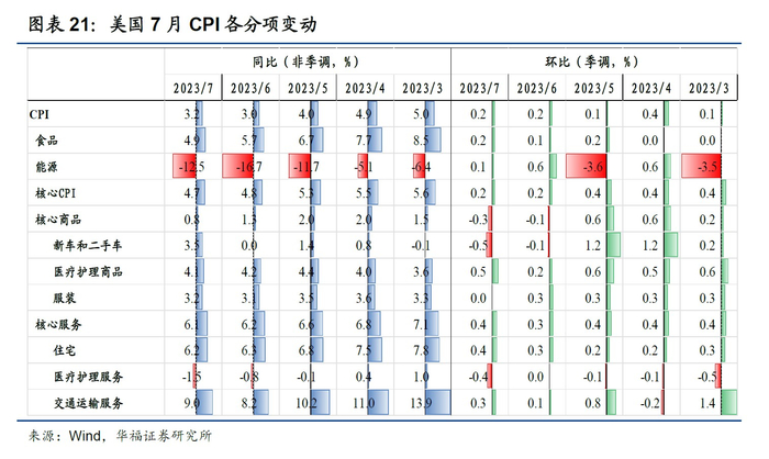从环比分项数据来看,在各分项与对应的权重相乘后,住宅(+ 0.4%)、交通运输服务(+ 0.3%)、食品(+ 0.2%)和能源(+ 0.1%)为CPI环比上升的主要贡献项。权重最高的住宅分项环比上升0.4%,前值0.4%。其中,业主等价租金和主要住所租金环比分别上升0.5%和0.4%。此前美国线上房地产信息平台Zillow表示,季节性趋势显示,房租环比增速在今年剩下的月份中会进一步下降,并可能在10月小幅下滑。但从先行指标来看,反映美国房地产景气度的NAHB住房市场指数7月升至56,为2022年12月以来连续7个月上升,因此住宅项环比增速未来有进一步上升的空间。具体详见《美国7月通胀反弹但小幅不及预期——美国7月CPI点评》。