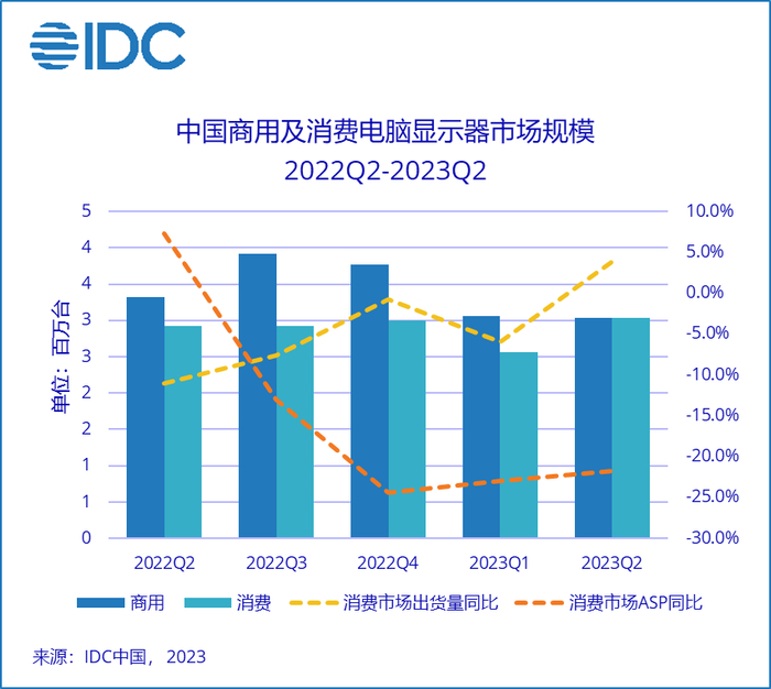 国际数据公司(IDC)电脑显示器季度跟踪报告显示,2023年上半年,中国电脑显示器市场出货量约为1169万台,同比下降4.4%;其中二季度出货约607万台,同比下滑2.7%,为2021年第三季度以来连续八个季度同比下跌。