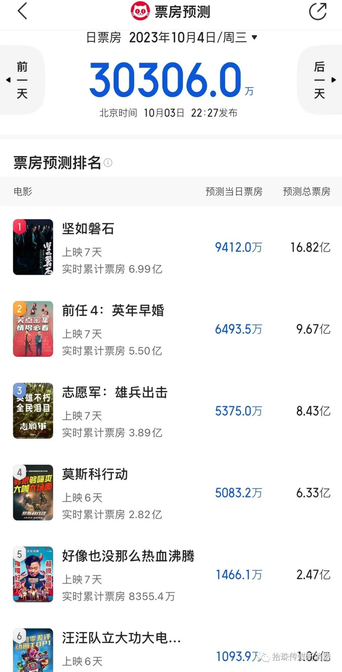 从片单看,定档10部影片(历年片单数供给相差不大),截止10月4日,上映第五天已拉开距离,据第三方数据显示,冠军影片《坚如磐石》预测票房16.82亿元,《前任4:英年早婚》预测票房9.67亿元,《志愿军:雄兵出击》预测票房8.43亿元,《莫斯科行动》预测票房6.33亿元,余下影片票房预测均低于2.5亿元,仅一部破10亿预测。截止10月4日,前三部电影票房占比分别33%、23%、19%。