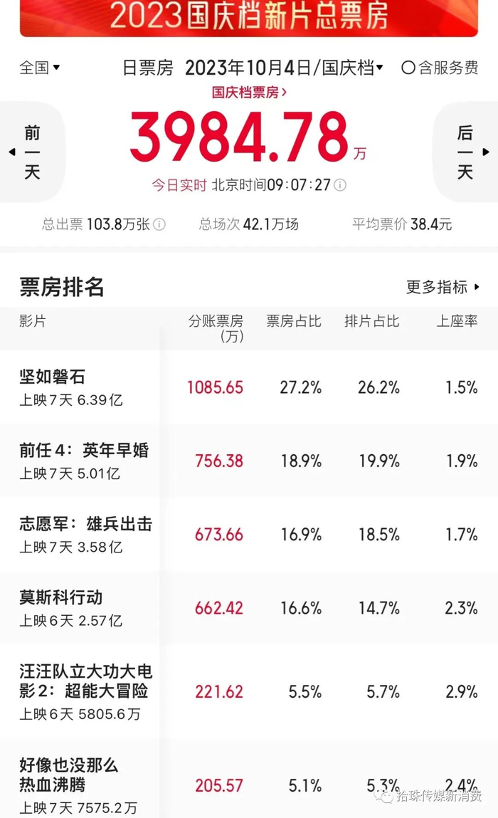 2023年10月2日是国庆档第四天,单日票房(不含服务费)3.41亿元(同比增加52%),观影人次同比增加50%。