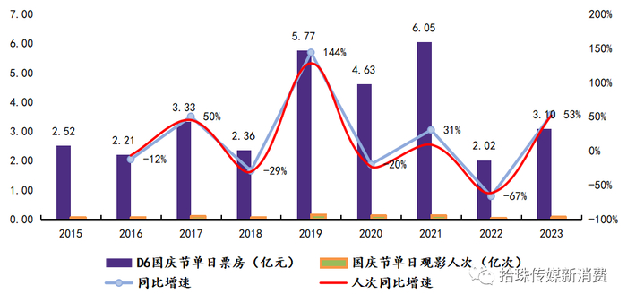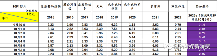 截止2023年10月3日凌晨,即国庆档第五天,单日票房(不含服务费)3.10亿元(同比增加53%),观影人次同比增加52%;高增长得益于低基数,纵观2015-2023年国庆档第五天,国庆单日票房由峰值2021年的6.05亿元降低至2022年的2.02亿元,2023年回升至3.10亿元,但未超过2019-2021年同期单日数据,核心在于影片供给的质量。