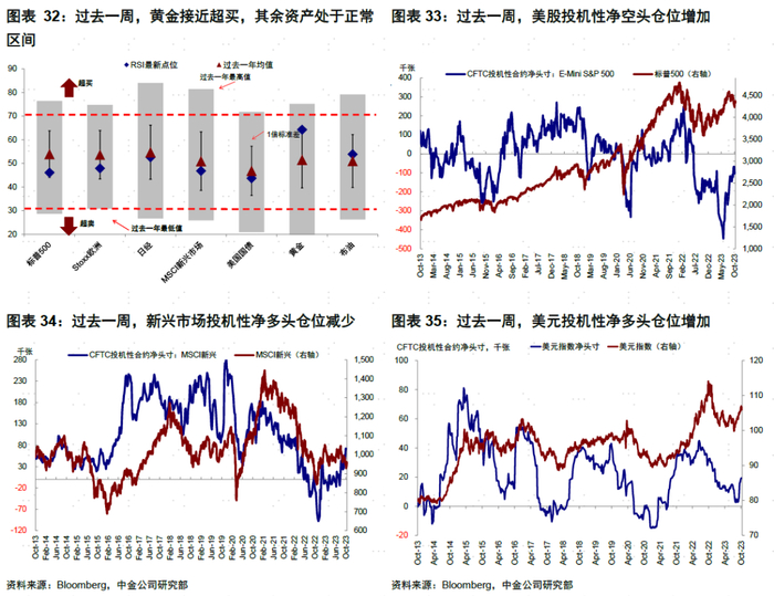 情绪仓位:黄金接近超买。过去一周,超买超卖情绪上,黄金接近超买,其他资产位于正常区间。投机性仓位方面,美股投机性净空头仓位增加,新兴市场投机性净多头仓位减少,美元投机性净多头仓位增加,黄金投机性净多头仓位减少,10年美债净空头仓位增加,2年美债净空头仓位减少。