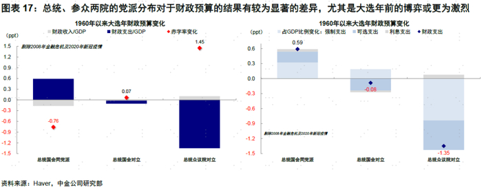 1)总统和国会分属同党派时,大选年财政扩张可能性大。财政支出占GDP比例(较前一年的变化,下同)抬升0.6ppt,财政收入占GDP回落0.2ppt,赤字率扩张0.8ppt;