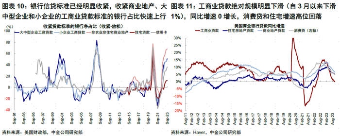 一是信用收缩较货币收缩出现明显时滞。在一个正常的周期中,不论松紧,货币到信用再到实体的传导通常较为顺畅。货币政策紧缩收紧金融条件,会导致狭义层面银行收紧信贷投放,广义层面抵押物价值收缩导致融资溢价变大,进而影响实际需求和价格。但在本轮周期中,美国的信用收缩相比货币紧缩出现了明显的延迟,货币虽然早已紧缩,融资成本高企,但信用收缩迟迟未见。究其原因,主要是因为疫情期间过大规模的财政刺激推高了实体经济部门和金融市场的回报预期,进而使得即便融资成本走高,信贷需求依然强劲。例如,银行借贷标准确实在加息后不久就开始收紧,当前商业地产贷款、工商贷款等标准收紧程度已经快速上升至接近2020年初期水平,但信贷规模同比增速自2022年底才开始明显下行,信用债利差也一直较低。