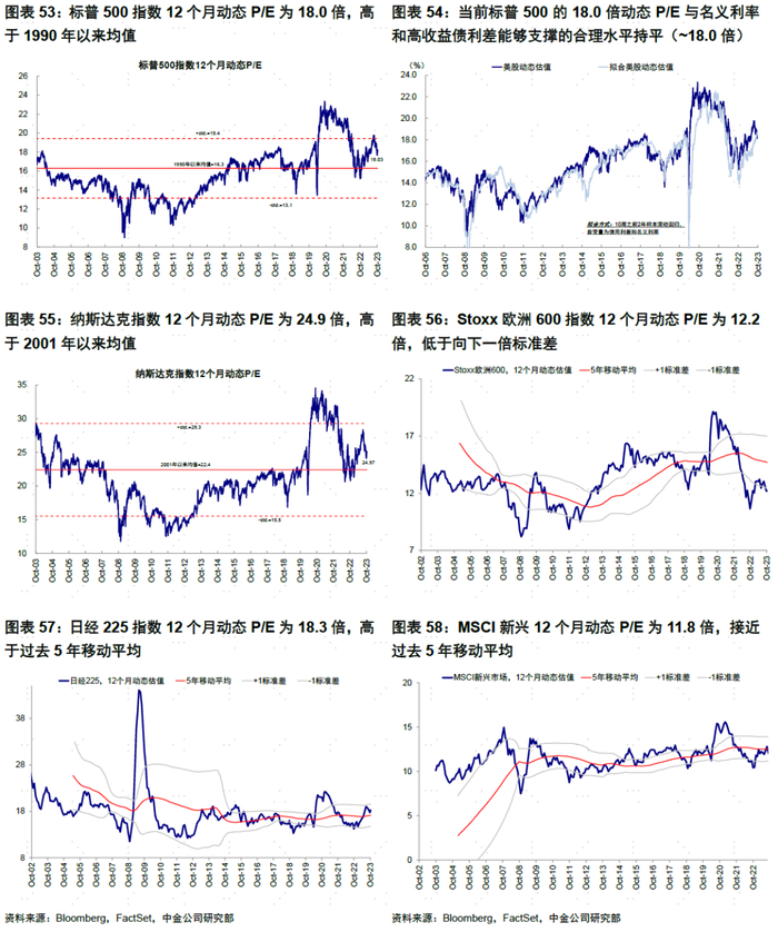 市场估值:美股估值持平于增长和流动性合理水平。当前标普500的18.0倍动态P/E持平于名义利率和高收益债利差能够支撑的合理水平(~18.0倍)。