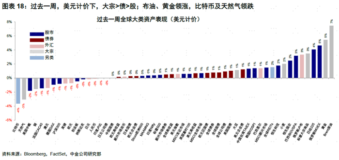 资产表现:>债>股;避险情绪引发原油黄金上涨,美债利率回落。本周初,包括美联储副主席杰斐逊和明尼阿波利斯联储主席卡什卡利等多位联储官员表态均偏鸽派,其中达拉斯联储主席洛根表示当前由期限溢价主导的利率上行或降低再次加息的可能性。受此影响,美债卖盘情绪收敛,利率从4.8%大幅回落至4.6%,美股也小幅回升。中东地缘局势扰动推升全球避险情绪升温,美债利率继续下行、黄金、原油分布大幅涨超5%和7%。美国9月PPI及整体CPI增速均高于预期,但由于核心通胀符合预期下行,美债利率虽有上冲但幅度不大,整体收于4.6%。