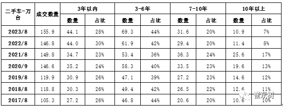 二手车的次新车交易表现较强,主要也是新能源车成为二手车的组成。二手车的交易结构目前来以三年以内的二手车增长比较突出,总体占比达到28%的比例。而3-6年达到44%的比例,两者比例都是相对较高的,也就是说,整个六年以内的二手车占到73%的比例,而七年以上的二手车,目前来看仅占到27%的比例。