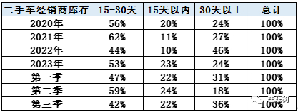 二手车的库存目前来看处于小幅增长之中,2季度库存压力相对较大,尤其是今年8月份的30天以上的二手车的,库存占比相对占比是比较低的,15到30天的二手车库存也达到20%的较高的比例,而15天以内的二手车的比例,仅有10%的状态,所以目前来看的话,感觉今年的整个二手车的运行压力相对还是比较大的,随着新车的政策的逐步的推动,导致二手车的交易价格实际上受到新车实际成交价格下移的影响,而带来二手车的价差的缩小,对二手车的经营也带来一定的压力。