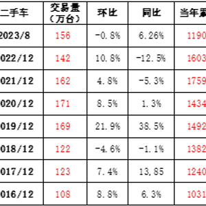 二手车行业发展重回快车道。2023年1-8月的二手车销量达到1190万台,同比增长13%。与此同时,由于二手车交易的档次不断提升,二手车交易额逐步的提升,去年二手车交易额达到10596亿元,今年1-8月份达到7419亿元的水平,体现了二手车的交易的产品档次不断提升。