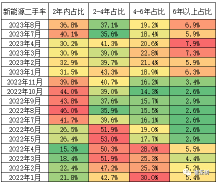 2023年8月,全国新能源二手车使用年限在2年以下的占比37%,较去年同期都处于高位水平。使用年限在2-4年占比37%,环比上月增1.5%,较去年同期提升,目前处于相对低位水平。使用年限在4-6年的交易量占19.2%,环比上月增长0.8个百分点,较去年处于相对较高水平。6年以上的占比较上月提升,较去年同期大幅提升。整体来看23年,新能源二手车车龄结构整体有长岭,车龄在4年以上的占比增长明显。