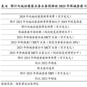 据国泰君安测算,随着通关后内地访港客的加速增长,同时基于2022年美元利率上升,折现率提升小幅压制新业务价值率,预计在2023年产品结构未发生重大调整假设下新业务价值率回升至80%,预计新单及价值率共同改善下保诚香港NBV增速为同比增长64.7%,并推动集团NBV增速同比增长15.0%。