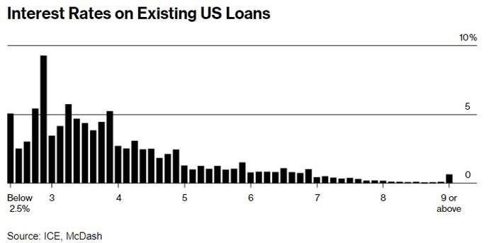 然而,由于所谓的锁定效应,供应端受到的影响似乎更为严重:有融资需求的那些房主们不愿放弃在利率触底时获得的廉价抵押贷款。这导致了自上世纪80年代以来最难以负担的住房市场,楼市销售额接近历史低点。