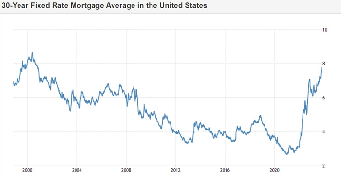 美国的购房者们去年以来一直面临着不断升高的借贷成本,一项重要的利率指标——30年期固定抵押贷款利率徘徊在8%附近。此外,房主也变得更不愿意挂牌出售房产,从而限制了待售房的库存规模。华尔街大行高盛的策略师们预计,美国抵押贷款利率将在一段时间内保持高位,预计到明年年底将降至略低于7%的水平。