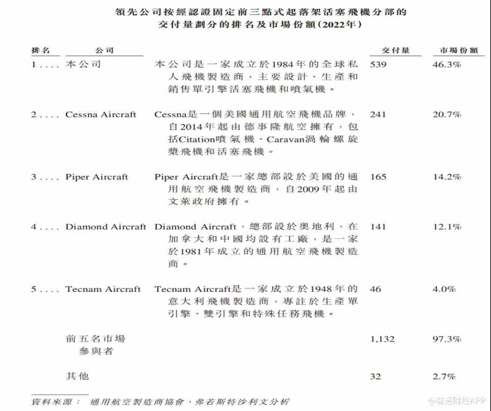 据悉,SR2X系列包括入门级飞机SR20以及SR22和SR22T,后两款飞机具备不断提升的性能和能力,以满足客户对单引擎活塞飞机的不同需求及偏好。根据通用航空制造商协会的资料,SR2X系列飞机于过去21年一直是最畅销的单引擎活塞机型。按2022年交付量计算,SR2X系列飞机占经认证固定前三点式起落架活塞飞机分部市场份额的46.3%。
