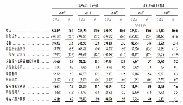 截至2020年、2021年及2022年12月31日止年度,公司的收入分别为5.87亿美元、7.38亿美元及8.94亿美元,复合年均增长率为23.5%,年度利润分别为0.36亿美元、0.72亿美元及0.88亿美元,复合年均增长率为56.2%。截至2022年及2023年5月31日止五个月,公司的收入分别为2.39亿美元及3.16亿美元,增长32.3%,期间利润分别为960万美元及1620万美元,增长68.9%。