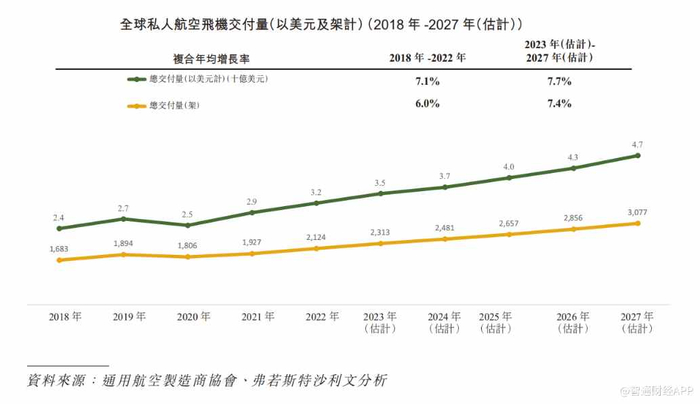 另一方面,私人航空飞机交付市场将保持平稳增长。弗若斯特沙利文报告显示,相对于通用航空飞机市场整体而言,私人航空飞机市场的交付量正在加速增长。私人航空市场受益于后疫情时代全球经济复苏、商业信心恢复以及全球高净值人士数量增加等数个因素。高净值人士对私人航空的兴趣不断增加的关键在于私人航空的机动性、隐私性、安全性、时间灵活性和全年可用性。受益于针对寻求最优质的个性化和定制化航空运输解决方案的客户的高端移动服务日益普及,预计私人航空飞机交付量在2027年将达到3077架,2023年至2027年的复合年均增长率为7.4%。