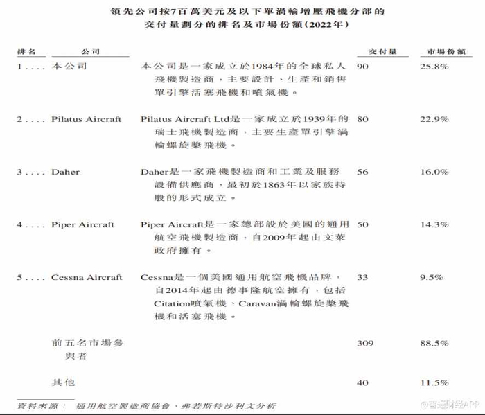 愿景喷气机针对私人航空业的不同及更高端市场,提供显著增强的性能、能力和规格,价格也较高。愿景喷气机通常最多可承载五名成年人和两名儿童。根据通用航空制造商协会的资料,自愿景喷气机于2016年首次交付以来,其已连续五年成为700万美元以下最畅销的喷气机。根据弗若斯特沙利文的资料,按2022年交付量计,愿景喷气机占700万美元及以下单涡轮增压飞机分部市场份额的25.8%。
