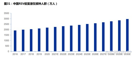 我国为全球合胞病毒流行高发国家之一,针对RSV病毒感染的预防,一直是一项重要但未被满足的医疗需求。根据沙利文分析,我国由于RSV感染引起的急性下呼吸道感染的发病率约为3.1%,目前在研RSV疫苗主要针对老年人,因此RSV疫苗潜在接种人群定义为中国育龄女性(15-49岁)及65岁以上老年人口。随着中国人口老龄化进程加快,未来潜在需求人群持续增长,预计2030年潜在需求人群将达到2968万人。