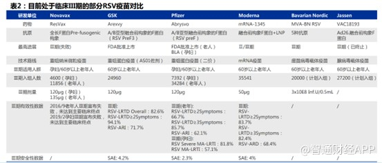 2023年GSK的Arexvy(老年人)和Pfizer的Abrysvo(老年人、孕妇)相继获批上市后,商业化表现十分优异。2023 Q3是Arexvy及Abrysvo首个销售季度,Arexvy实现营收7.09亿英镑(约8.70亿美元),全年销售指引9~10亿英镑;Abrysvo实现营收3.75亿美元。很可能获批的全球第三款RSV疫苗来自Moderna,已经高调宣布预计其2024年3季度才能实现完整季度销售的RSV候选疫苗明年全球销售将达到10亿美元。这样的市场表现远超业界和资本市场预期,也力证了该领域的疾病负担和医疗需求。