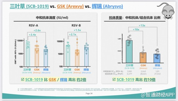 首先,SCB-1019具备优异的临床前数据。在临床前试验中头对头比较已商业化的两款RSV疫苗,SCB-1019展现了更高的中和抗体和更高质量的抗体水平。在免疫原性实验中,同等剂量情况下,SCB-1019诱导的针对A和B两个RSV株系的中和抗体水平都是已商业化两款RSV疫苗的约2倍;同时SCB-1019诱导的中和抗体比值超过两个已商业化RSV疫苗约10倍。显示出SCB-1019有潜质成为全球更高效的候选RSV疫苗竞品。