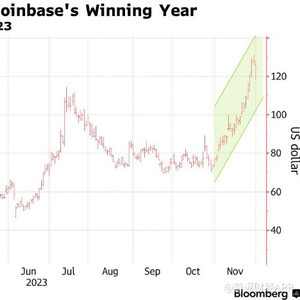 由于竞争对手的法律清算带来的明确性,Coinbase今年的势头一直在增强。美国证券交易委员会(SEC)也在逐步为在美国上市的比特币ETF开绿灯,Bloomberg Intelligence预计此类产品最早将于明年1月初获得批准。到目前为止,比特币在2023年已经飙升了近130%,其中11月份的涨幅约为9%。