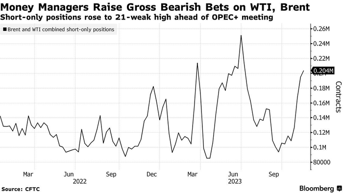对冲基金在备受期待的OPEC+会议召开之前加大了对油价的看跌押注。洲际交易所和美国商品期货交易委员会(CFTC)的数据显示,截至11月28日当周,对冲基金的石油空头头寸增加了6,665手,至210,135手,为21周以来最高水平。