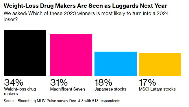 根据一项最新调查,受访者认为,与今年股票市场上的其他明星股相比,减肥药制造商诺和诺德(NVO.US)和礼来(LLY.US)更有可能在2024年成为“输家”。
