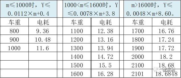 纯电动乘用车产品,按整车整备质量(m,kg)的不同,百公里电能消耗量目标值(Y)应满足以下要求:m≤1000时,Y≤0.0112×m+0.4;10001600时,Y≤0.0048×m+8.60。