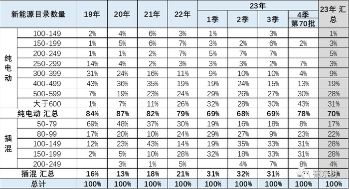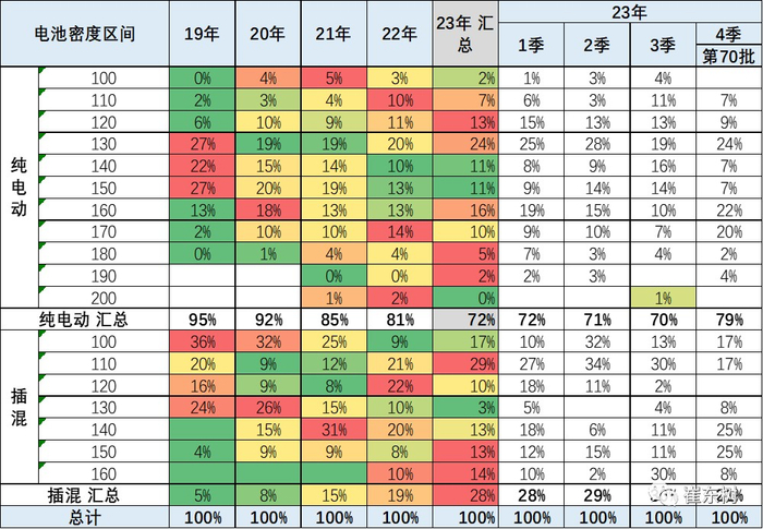 近几年纯电动车电池的能量密度提升缓慢,2023年逐步市场化推动技术提升,体现乘用车的产品脱离补贴的实际效果较好。120-140瓦时和170-190瓦时的车型推出增多。