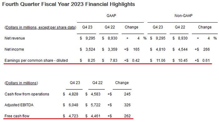 博通第四季度营收为92.95亿美元,同比仅增长4%,许多投资者和分析师似乎对此并不感冒。但他们忽略的是,博通的利润和自由现金流增长速度通常快于营收增长速度,第四季度再次出现这种情况: