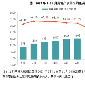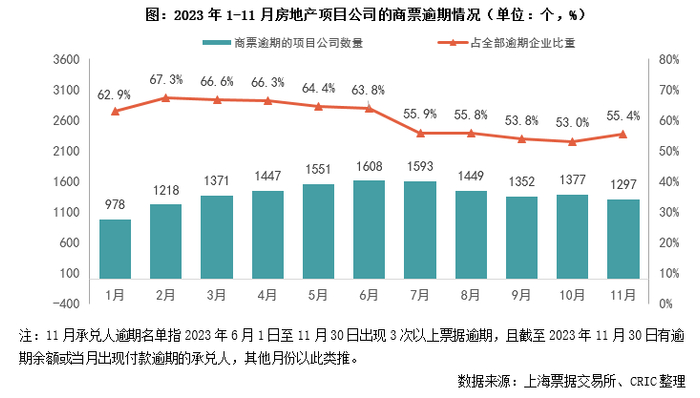 近期票交所公布的《截至2023年11月30日承兑人逾期名单》显示,2023年6月至11月末发生3次以上商票逾期,且月末有逾期余额或当月出现票据逾期行为的房地产项目公司数量1297个,环比减少5.8%、同比大幅减少60.7%,占全部商票逾期企业的比重环比增加2.4pct至55.4%。