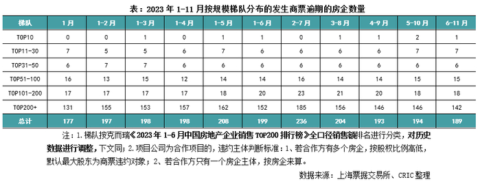 从持续逾期的承兑人梯队看,2023年6月至11月末TOP10、TOP11-30、TOP31-50、TOP51-100、TOP101-200和TOP200+发生持续逾期的房地产项目公司148、502、398、360、240和426个。
