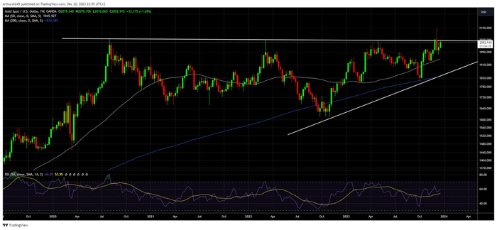 2024年即将到来,黄金面临一定的机遇与风险。而从技术面来看,金价上涨前景乐观,有望突破2500美元。