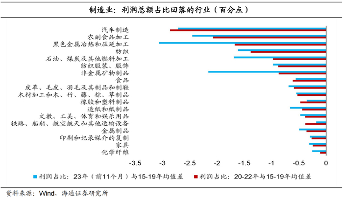 相比之下,制造业的利润比重在2015年至2019年平均约87.2%, 2021年该比重虽然小幅回落,但是仍保持较高水平。但从2021年开始,该比重从84.5%降至2022年的76.5%,2023年前11个月该比重为73%,与往年同期差距较为明显。
