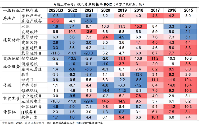 同时,也有部分领域的投资回报具备较大提升空间。在社会服务领域,从2023年三季度看,酒店餐饮、旅游及景区的投资回报率已经转正,但是相比2020年之前仍有差距。交运领域的航空机场、传媒领域的影视院线的投资回报率虽然降幅收窄,但是仍处于负向区间。我们认为,这主要与疫情之后的“疤痕”效应有关。而教育行业的投资回报率在过去三年始终为负,我们认为这或受到“双减”政策的影响。在商贸零售领域,互联网电商的投资回报率在2021年回落转负,去年降幅收窄,不过与2020年及以前相比差距较大。