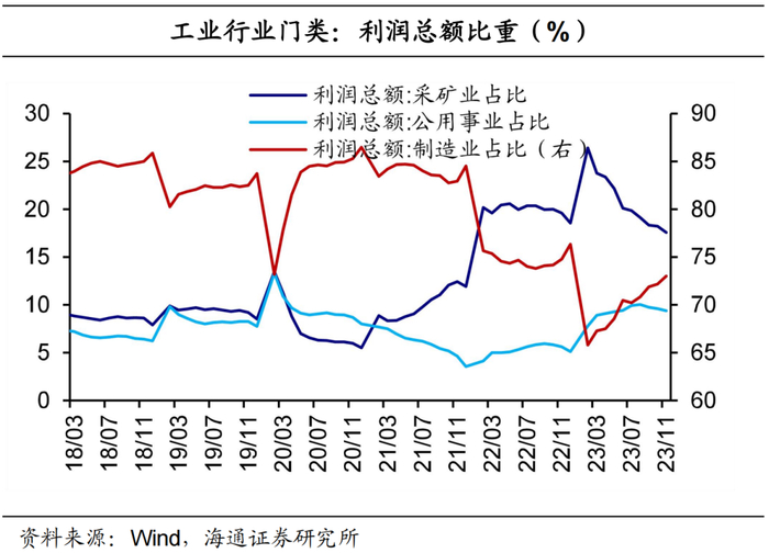 在行业间,即使企业盈利变化趋势相似,但是背后的增长逻辑可能有着明显差异。我们认为,过去两年企业盈利稳步增长的行业主要有以下几条主线。第一,公用事业、采矿业利润占比较高,我们认为主要与价格的变动有关。从2020年,采矿业的PPI大幅上涨,带动营收增加,这使得该行业的利润增速和占比明显攀升。2023年以来,伴随着大宗商品价格的调整,叠加下游需求不足,企业盈利开始走弱。不过,采矿业的量的增加对利润有所支撑。