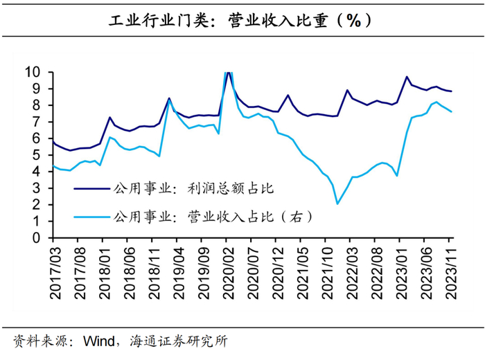 在公用事业,2021年以来,该行业的利润比重先降后升。它在2015年至2019年平均约6.9%,但是在2021年、2022年分别降至3.5%、5.1%,直到去年明显回升。2023年前11个月,采矿业、公用事业的利润比重分别为17.6%、9.4%,均高于2018年、2019年的水平。