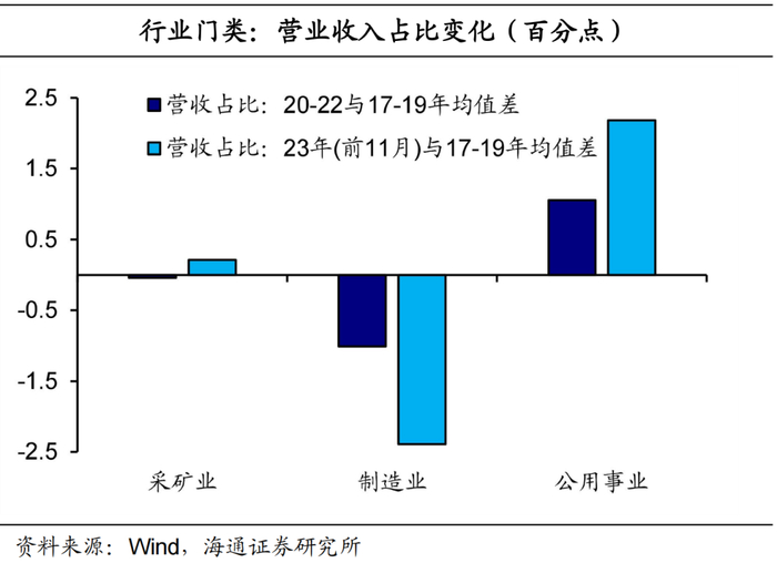 接下来,我们从行业利润占总体的比重考察过去三年相比疫情之前的变化。在结构方面,相比2019年及之前,目前制造业的利润占比回落,采矿业、公用事业占比增加,工业行业门类的分化较为明显。