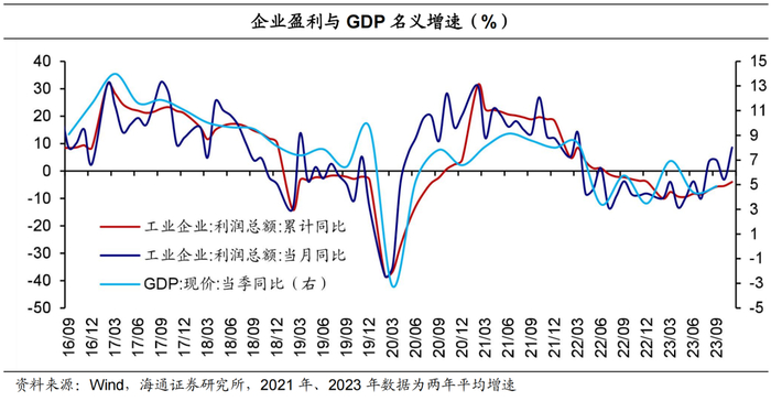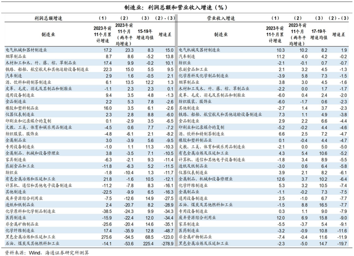 接下来,我们通过利润增速考察企业盈利规模的变化。研究发现,从2023年前11个月累计同比增速看,经过剔除基数影响处理后,出口相关的两年平均增速高于疫情前几年,房地产相关行业的增速偏低。