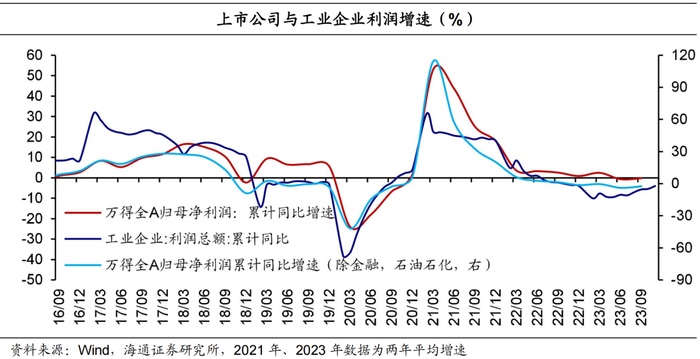 由于规上工业企业是年主营业务收入2000万元及以上的法人单位,难以反映第一产业、第三产业以及建筑业的盈利状况。所以,我们也结合上市公司数据进行考察。从整体A股上市公司的归母净利润增速看,与工业企业走势较为一致。