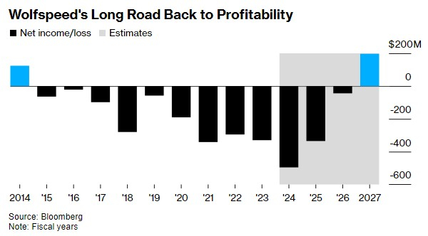 根据分析师的平均预期,Wolfspeed第二财季持续经营净亏损将达到1.39亿美元。自2014年以来,该公司一直未能实现年度盈利,预计要到2027年才能恢复盈利。