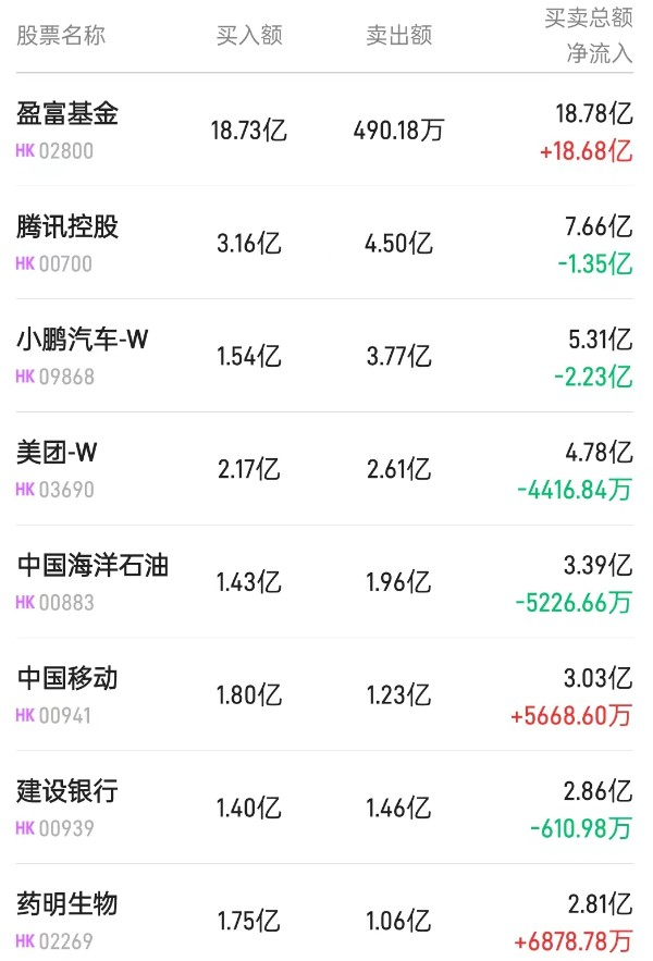 北水净买入最多的个股是盈富基金(02800)、恒生中国企业(02828)、南方恒生科技(03033)。北水净卖出最多的个股是小鹏汽车-W(09868)、腾讯(00700)、建设银行(00939)。
