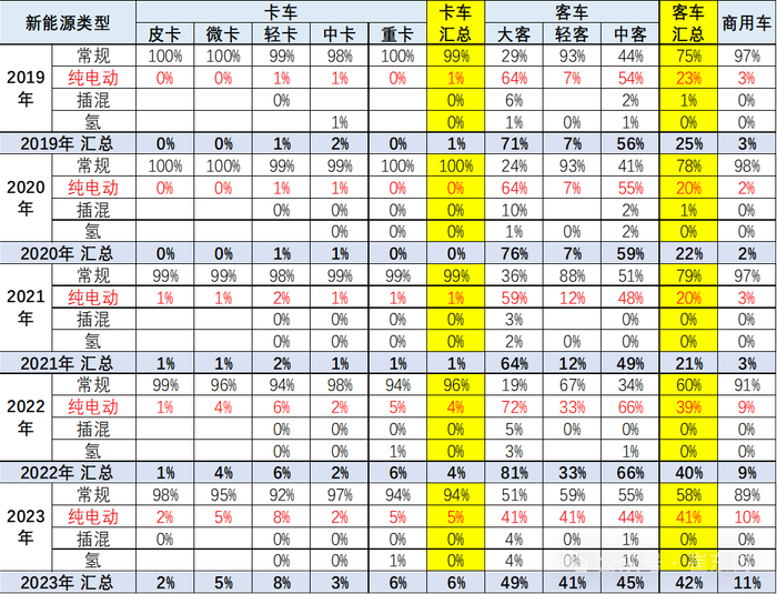 2023年卡车新能源渗透率6%,客车42%,均有小幅提升。