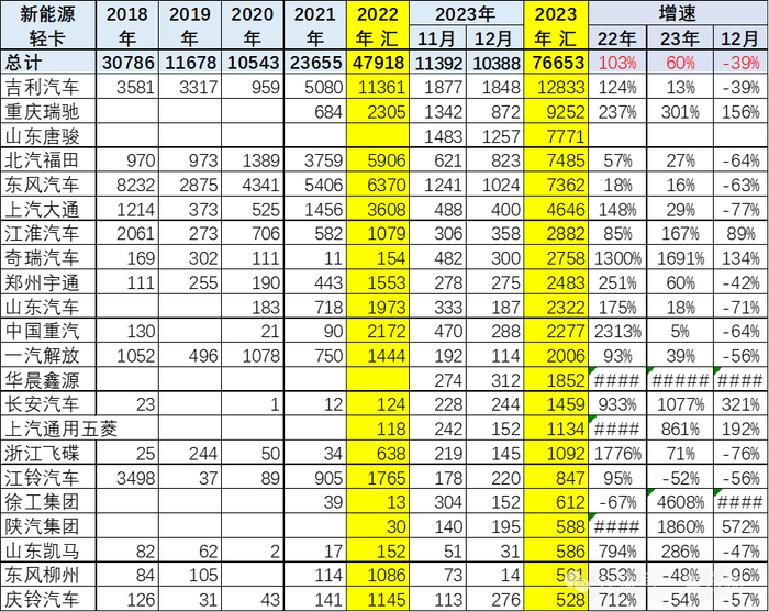 新能源轻卡的主力企业是吉利汽车以及重庆瑞驰等,尤其是吉利汽车在近两年在新能源轻卡表现来看相对极其优秀。