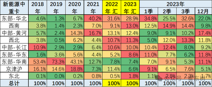 新能源卡车市场主要在华北、西北、中部黄河地区,并非在华东、华南地区,这也是资源等重工业在北方,南方的产业较轻。新能源重卡总体市场在西南市场、在中部黄河市场、在华北市场,总体来看表现相对强,尤其在华北市场,总体份额达到29%的超强水平。而西南、西北市场近期稍有提升,主要也是煤炭、钢铁等这些主力产业受到政策约束,不得不用电动重卡。