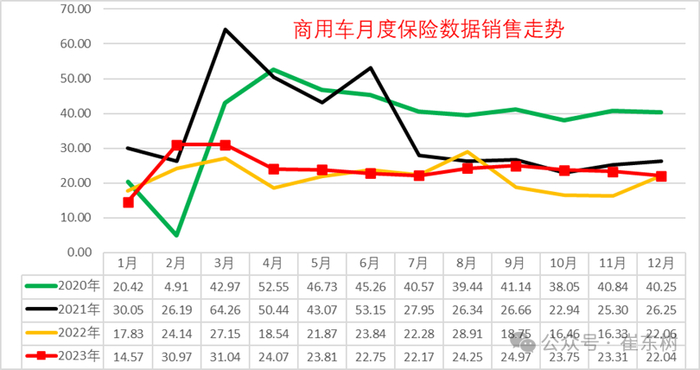 2023年商用车车市呈现总体较稳的走势,月度走势与2022年的走势相近,12月相对平稳。疫情的因素对去年商用车影响较大,但2023年的需求回暖体现的不明显。