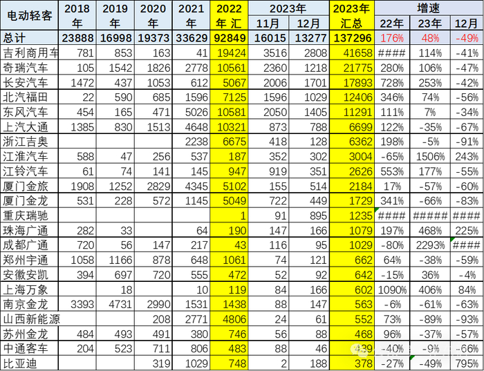 从2019-2021年,整个新能源商用车的渗透率在3%左右水平,2022年达到9%,2023年1-12月份达到11%的良好水平,体现了新能源商用车强势增长良好态势。