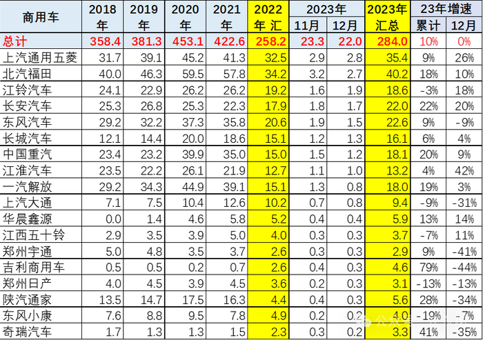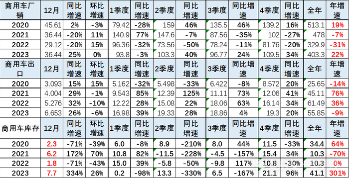 近几年国内商用车市场呈现需求快速下降趋势。从2020年的超高销量,到2021年的政策进入期。2022年全年处于低谷期。2023年1-5月因低基数实现同比增长,9-12月基数较高,因此12月商用车销量22万台,同比增长0%,环比下降5%。2023年1-12月商用车国内销量实现288万台,同比增长11%。2023年商用车市场回归相对平稳走势,没有出现国内持续暴涨的特征。