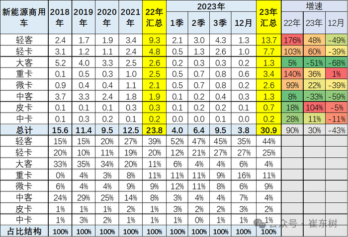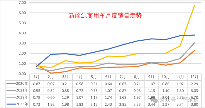 2023年新能源商用车整体呈现1-3月份低位回暖,5-12月份又强势增长的特征。整体来看,5-11月份持续创出2023年的新高水平,也呈现了一路向上的新能源商用车的较好增长局面。12月的走势平稳,主要是基数异常干扰,目前归回常态是好事情。