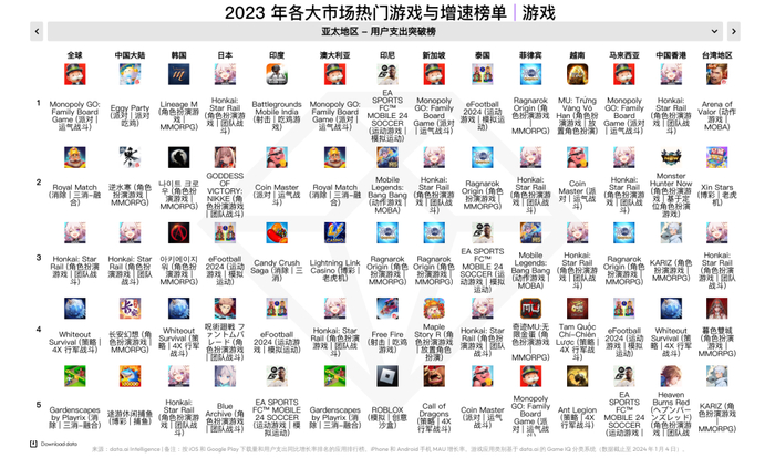 2023 年全球热门手游畅销榜前三分别由 Candy Crush Saga 、Honor of Kings(王者荣耀)和 ROBLOX 摘得。多款射击游戏在不同市场登顶畅销榜,例如:PUBG MOBILE 在沙特阿拉伯、阿联酋等多个中东市场表现优异,Free Fire 在印度、拉美和东南亚市场拥有绝对统治力,Call of Duty 则在拉美多个地区与 Free Fire 保持激烈竞争。中国大陆、韩国与日本市场用户支出最高的手游分别是 王者荣耀 、天堂M 以及 怪物弹珠 。